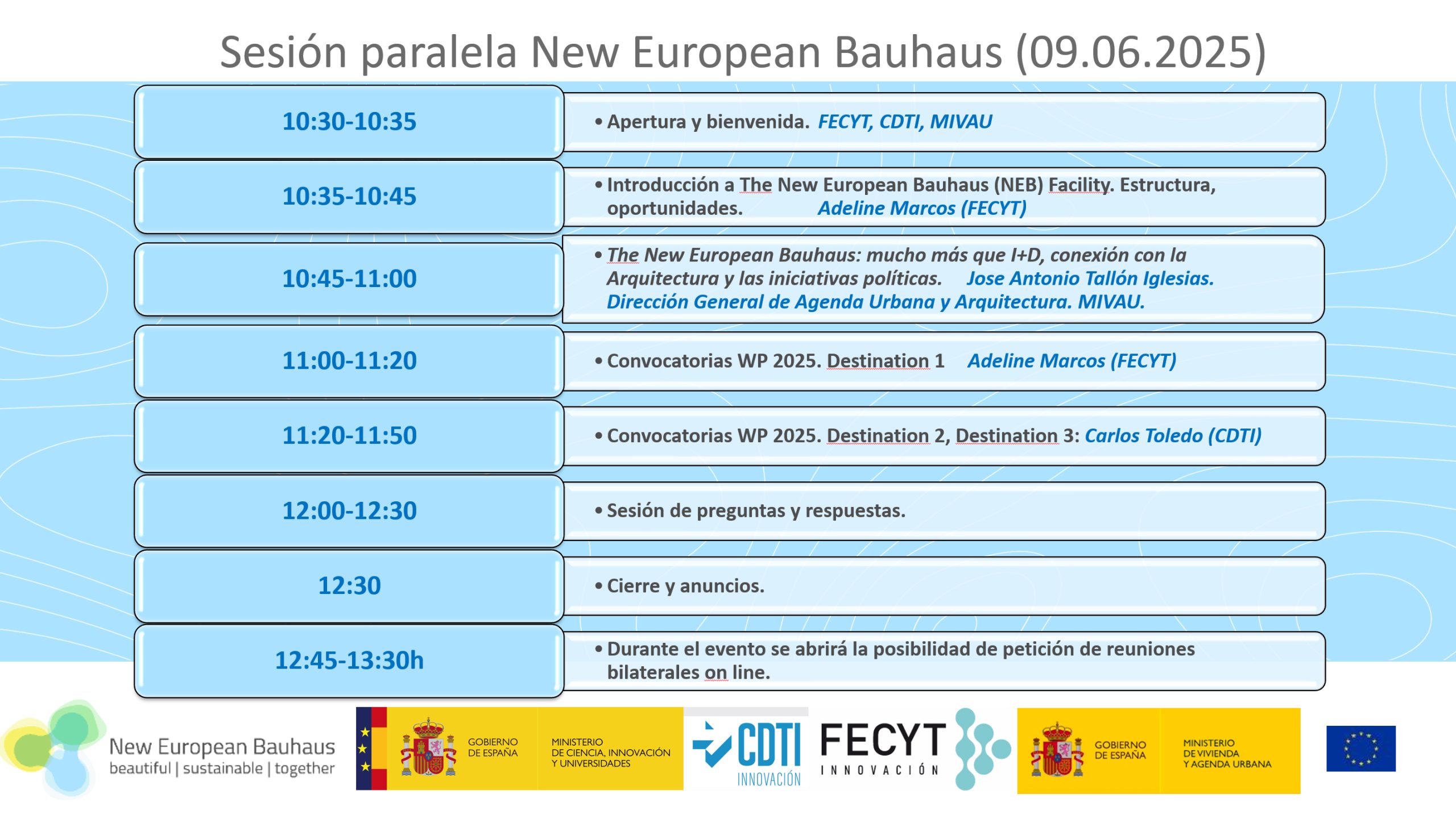 Esta reunión tendrá una duración de en torno a 2 horas y media, y contará con Adeline Marcos, de la Fundación Española para la Ciencia y la Tecnología (FECYT), José Antonio Tallón Iglesias, de la Dirección General de Agenda Urbana y Arquitectura del MIVAU, y Carlos Toledo, del CDTI. El programa detallado y el enlace de inscripción están disponibles en este enlace.