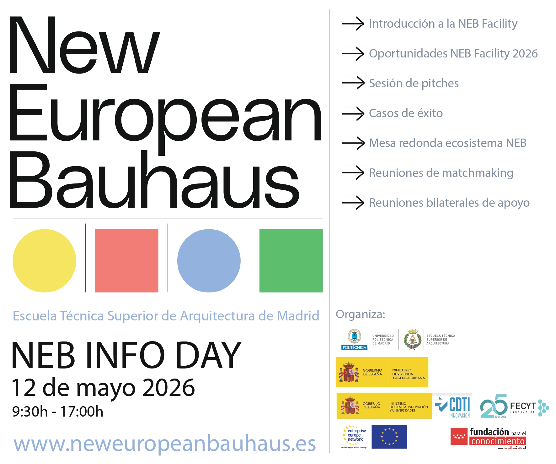 El martes 12 de mayo, en el contexto del lanzamiento de las nuevas convocatorias de NEB Facility 2026, se celebrará un evento presencial que motivará el conocimiento de éstas y otras oportunidades en el marco del ecosistema New European Bauhaus. Este Infoday se celebrará en Madrid, en concreto, en las instalaciones de la Escuela Técnica Superior de Arquitectura (ETSAM) de la Universidad Politécnica, en horario previsto de 9.30 a 17.00 horas.