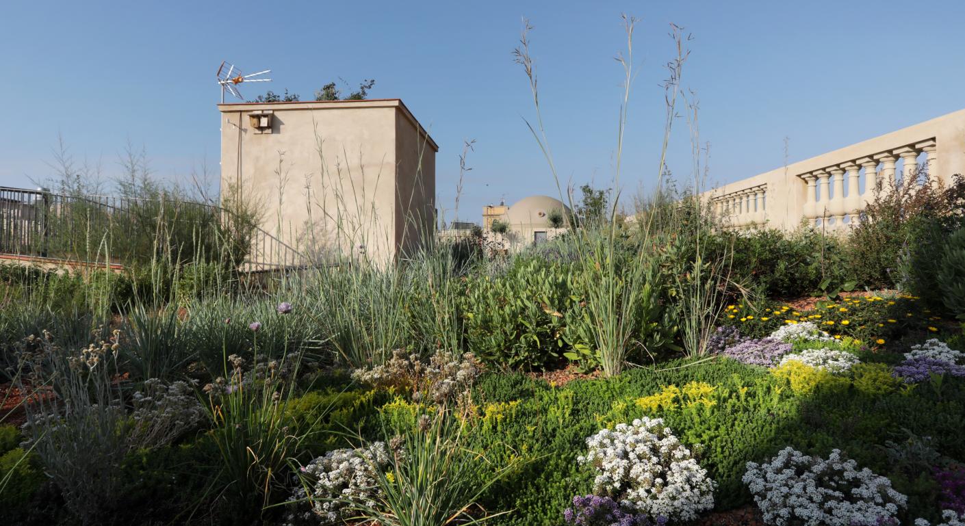 Se recuperó completamente la cubierta y se instaló el jardín utilizando el peso de unas dunas de tierra, bancos empotrados y caminos de grava como balasto. Esto significa que el jardín no está directamente unido al edificio y, por consiguiente, no tiene un impacto permanente en el mismo.