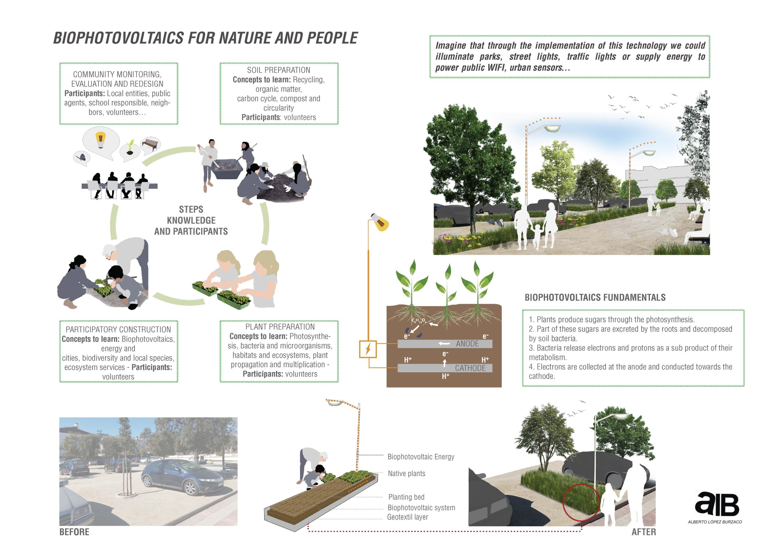 La biofotovoltaica aprovecha los subproductos de la simbiosis existente entre plantas y bacterias. Este proyecto tiene como objetivo extrapolar este concepto de simbiosis a los seres humanos, aprovechando la colaboración de diferentes perfiles de voluntarios (por ejemplo, familias, estudiantes de escuelas locales, ancianos, personas en riesgo de exclusión social) para construir no solo una infraestructura verde sino también una mejor comunidad donde todos se sientan conectados y apreciados y puedan compartir su conocimiento y experiencia.