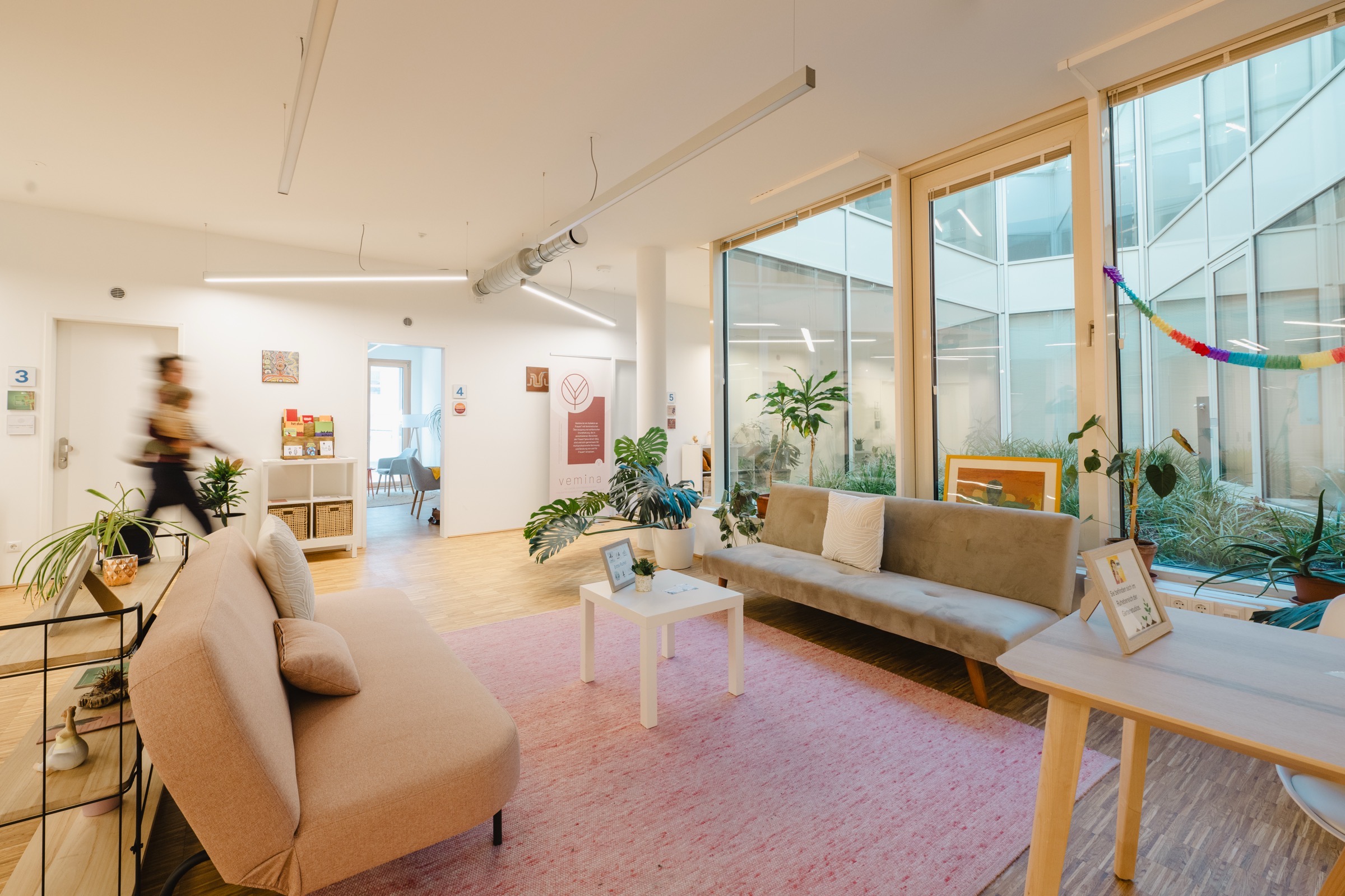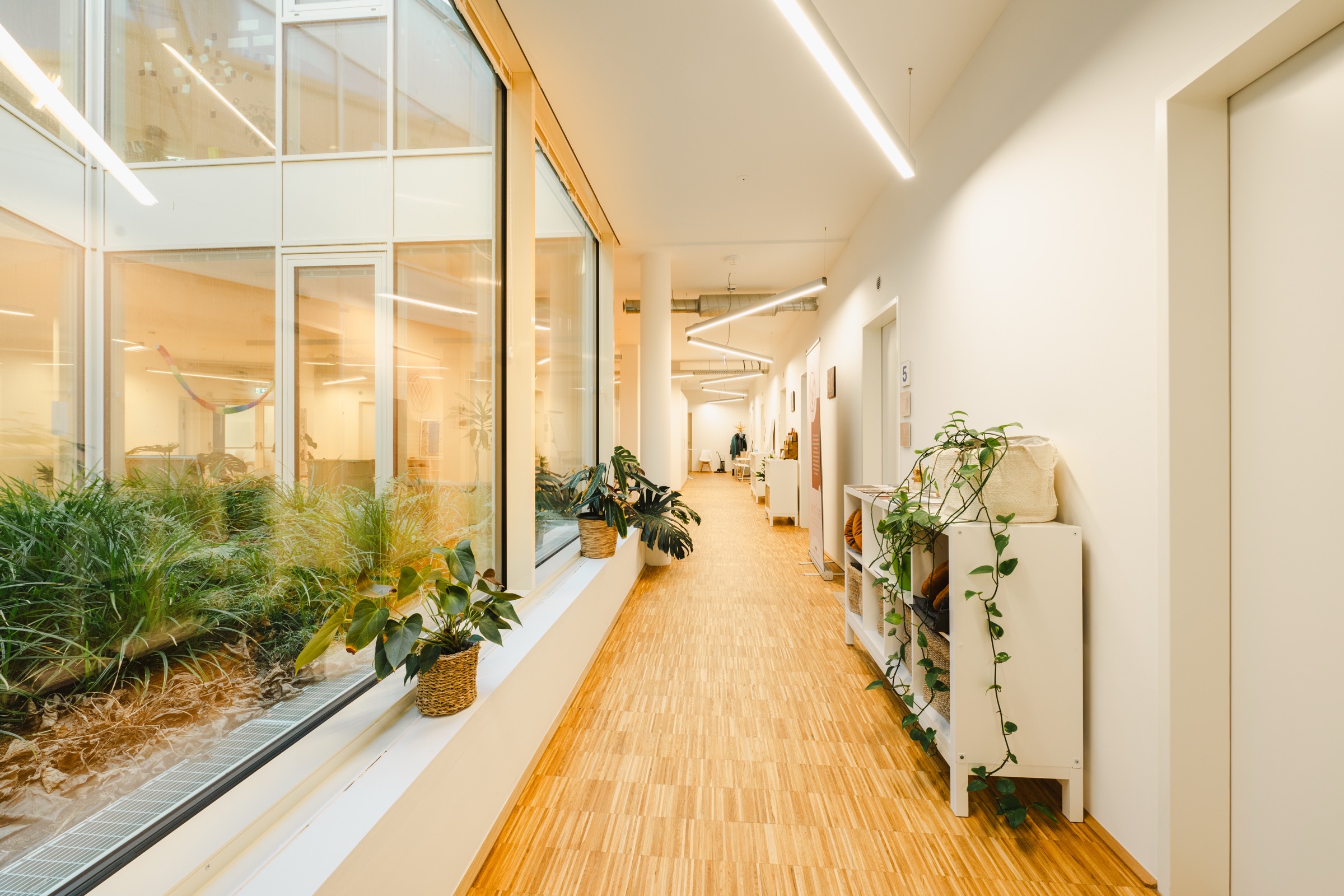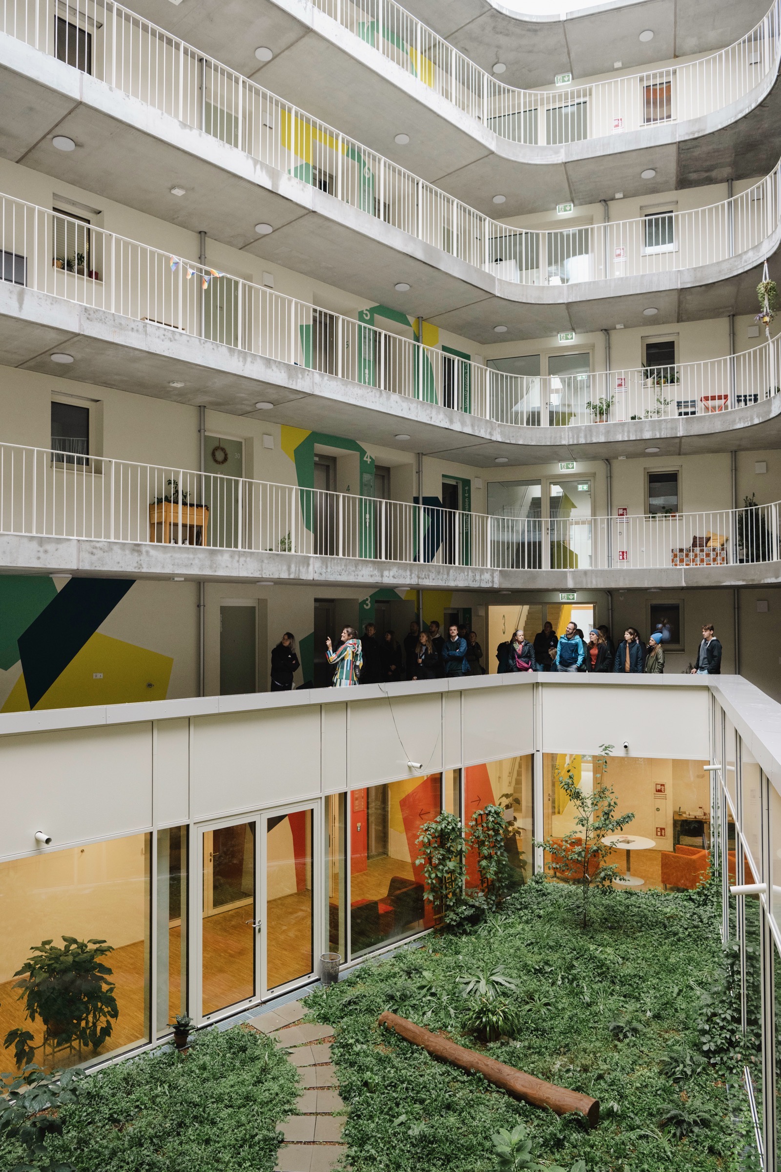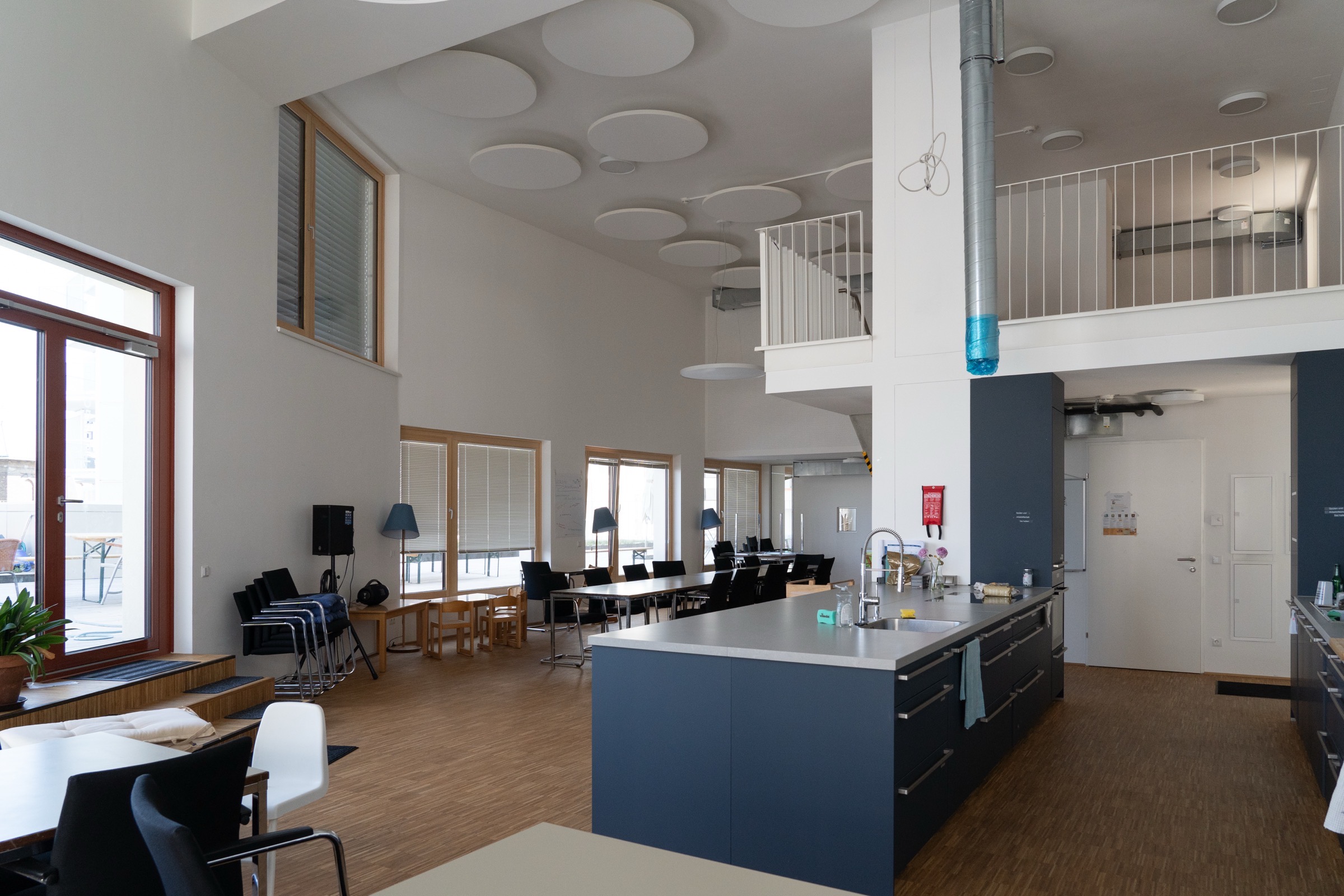 Este proyecto, ubicado en Viena (Austria), se basa en una edificación que combina vivienda asequible y espacios de trabajo compartido. Consta de 48 apartamentos, 9 habitaciones de huéspedes, amplias zonas comunitarias y unas 3.500 m² de espacio laboral (incluyendo coworking, salas de terapia, reuniones, eventos y un jardín de infancia bilingüe). La gestión del edificio está organizada como una cooperativa de sus miembros, que participaron en el diseño y en la toma de decisiones a través de un proceso participativo, lo que fomenta la pertenencia, la comunidad y la colaboración entre residentes, autónomos y pequeñas empresas.