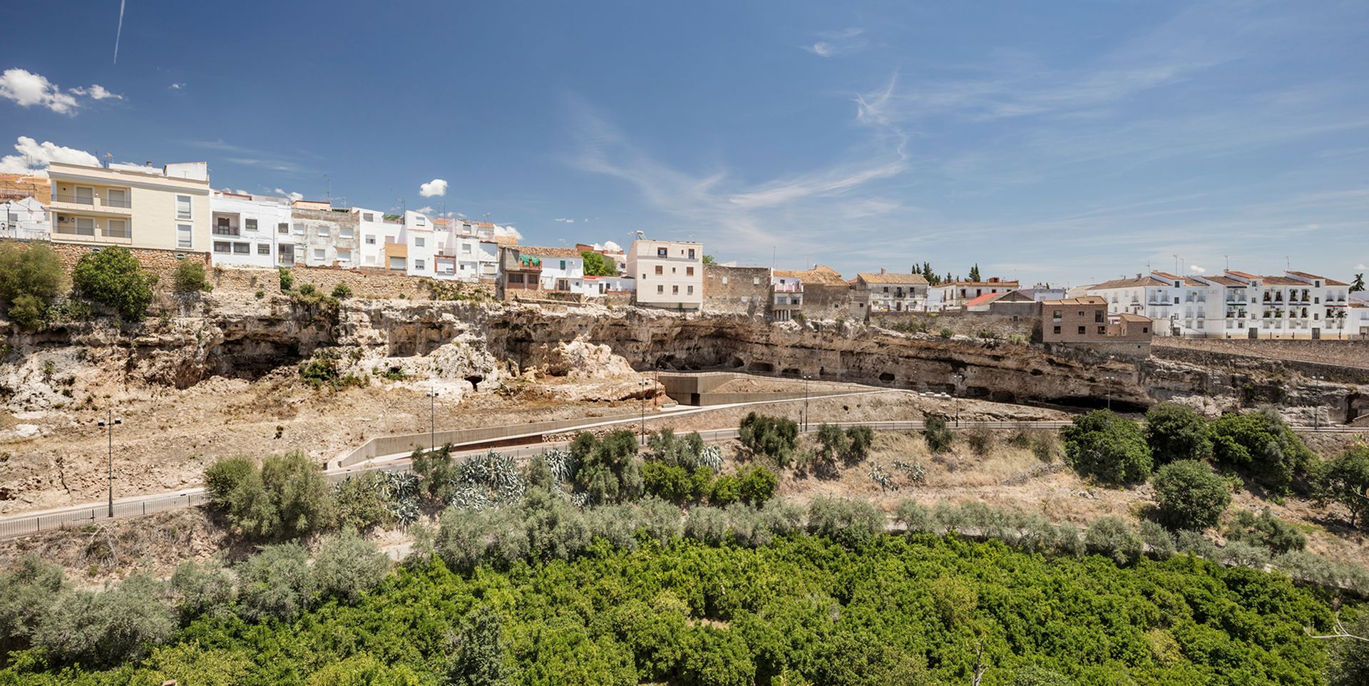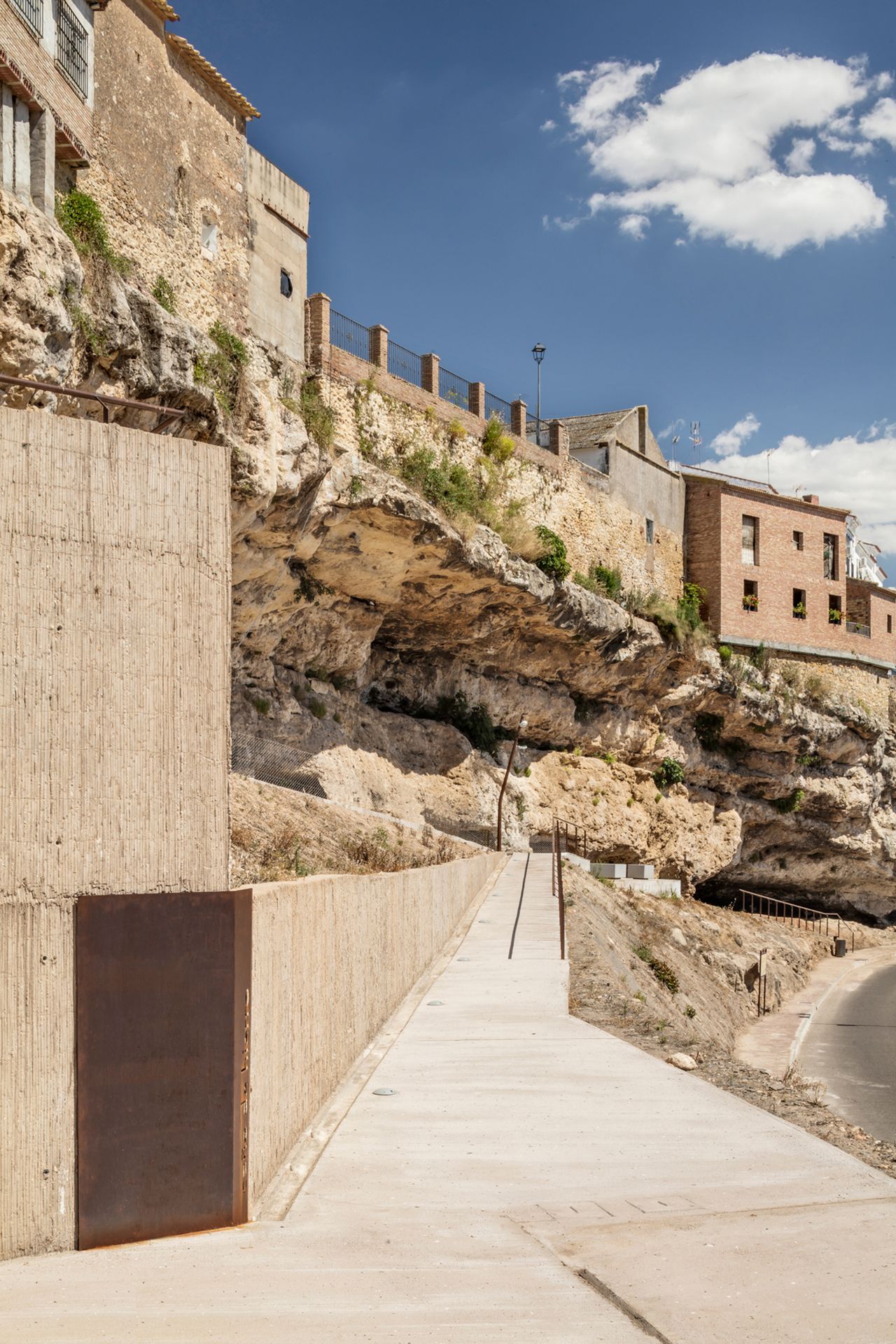 Para la puesta en valor del Caño de Hierro se propone un paseo peatonal, que parte de la carretera de acceso al pueblo y que culmina en la mayor de las cuevas, la Cueva de las Carretas. El paseo debe salvar los nueve metros en altura y el margen en superficie para resolver el ascenso es limitado. Se trazan seis muros de contención, seis cortes en el terreno, de los cuales resulta el paseo peatonal, un trazado geométrico que resuelve el ascenso y la transición de una vía rodada a un entorno natural, agreste.