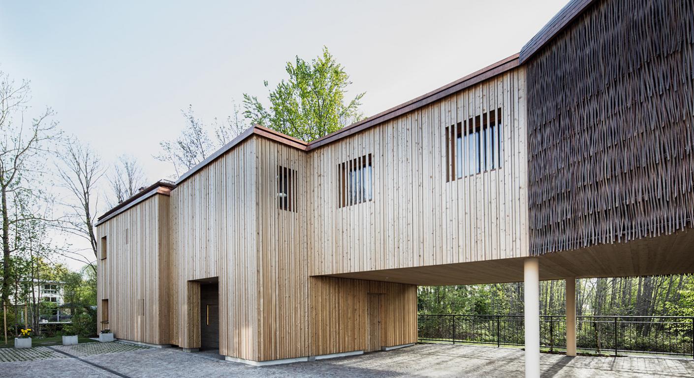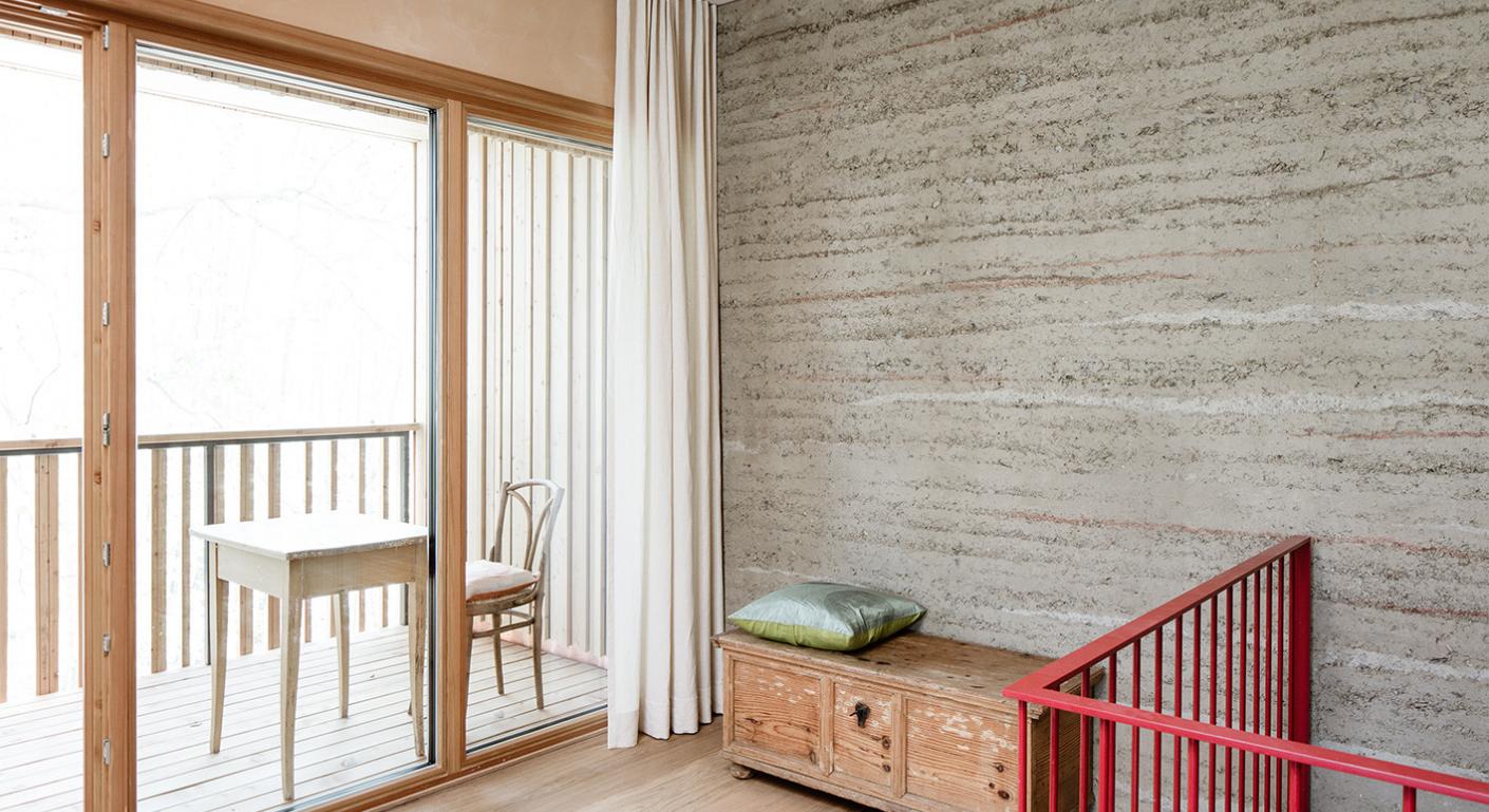 El edificio, diseñado por la arquitecta Anna Heringer, está hecho de madera y tierra, materiales que están presentes en el bosque aluvial vecino y que hacen que el edificio esté perfectamente integrado en su entorno. La estructura está conformada por bloques de tierra prensada llamados ERDEN PURE, idea y técnica desarrollada por el arquitecto Martin Rauch y ganadora de otro de los Premios Nueva Bauhaus Europea de 2021. Por fuera, la fachada combina el mimbre con los listones de madera de alerce y sauce sin tratar. En el interior encontramos suelos de barro-caseína y cerámica artesanal.