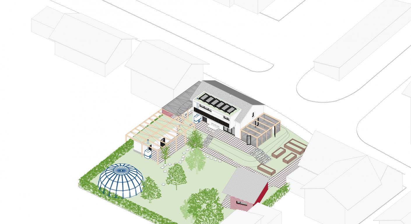 El edificio también acogerá a una familia, así como un jardín comunitario, una «biblioteca de herramientas», un invernadero solar acuapónico pasivo y una cúpula que se utilizará como habitación temporal.