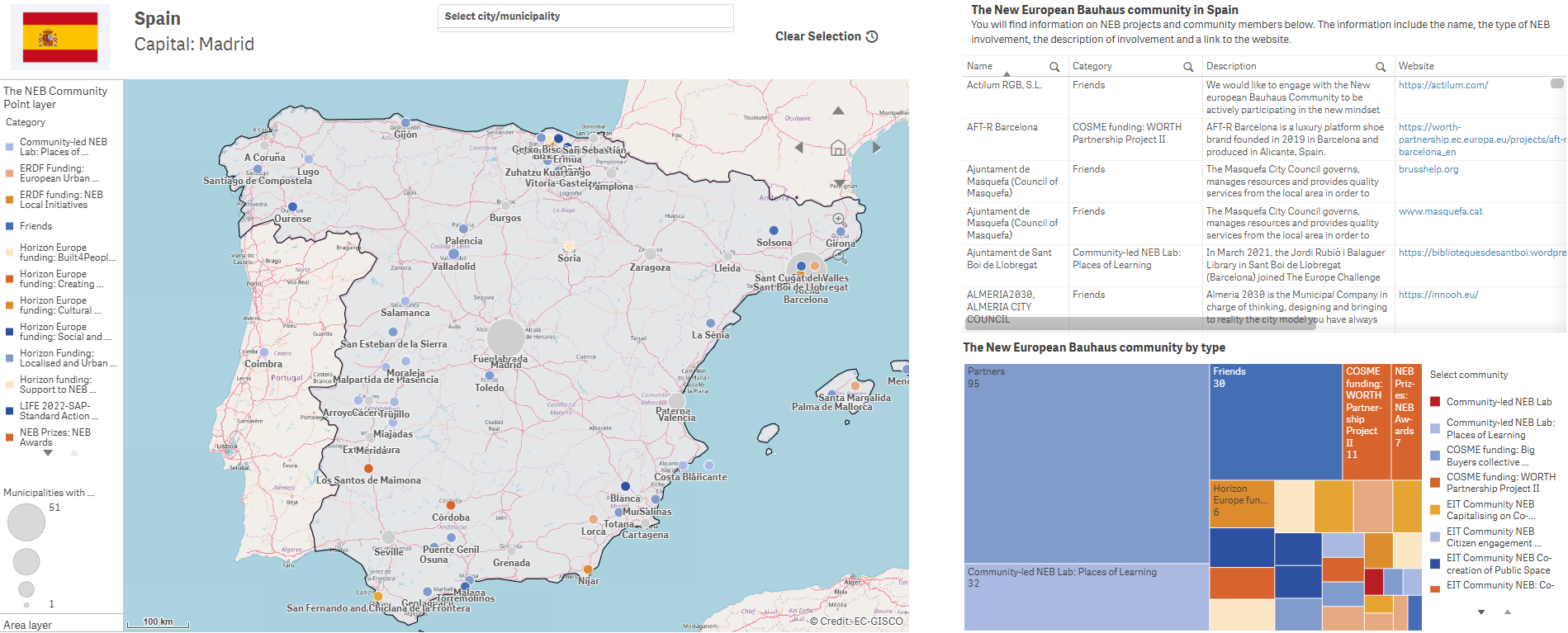 La Nueva Bauhaus Europea también colabora con el programa COSME, enfocado en el mercado interior, la industria, el emprendimiento y las PYMES, así como con el Fondo Europeo de Desarrollo Regional (FEDER). Desde luego, el mapa interactivo o dashboard es una oportunidad única para conocer todo esto y mucho más.