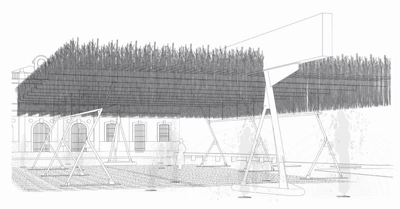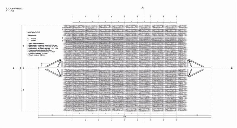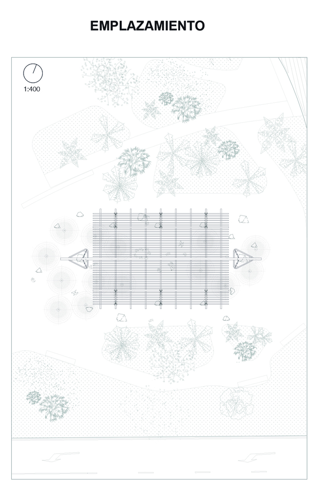 Es por eso que son estructuras efímeras con personalidad y carácter fuerte, y, en esencia, una representación tangible de los folclores tradicionales y modos de vida de cada localidad. Así es Espartal, una propuesta de ELE Arkitektura, GA Estudio, Florencio Galecio y Juan Gubbins que, ya en sus planos, evidencia un carácter ambiental y simbólico: Un auténtico cielo de ramas y hebras de esparto.